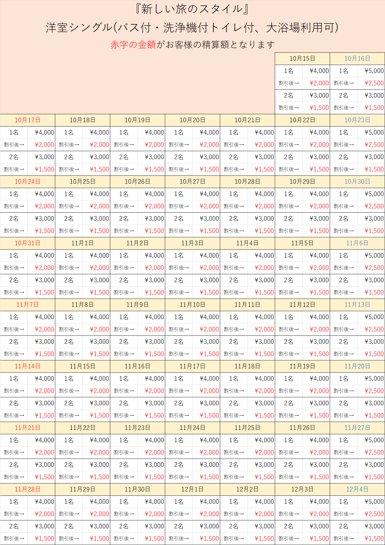 新しい旅のスタイル料金表(お部屋タイプは五つございます)