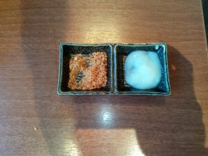 ニンニクは必要であれば声がけすれば出してくれるというシステムです。2種類のニンニクがあり、生のすったニンニクと揚げた細かいニンニクです。ニンニク好きの方はラーメンに入れるとさらに美味しさが増し、お薦めです。「らーめん海鳴」の店員さんは接客態度、気配りも好ましい。お客さんに対して、誠心誠意のもてなしが込められている印象。