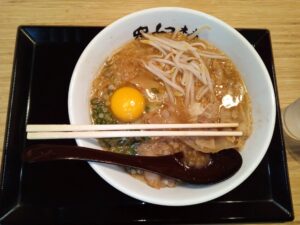 今回は期間限定メニューの「徳島ラーメン」を食べました。徳島ラーメンは、醤油とんこつベースのマイルドな茶系スープ、甘辛く煮込んだ豚バラ肉、生卵、メンマ、ネギ、もやしが入ったすき焼き風ラーメンで、チャーハンとの相性抜群でした。