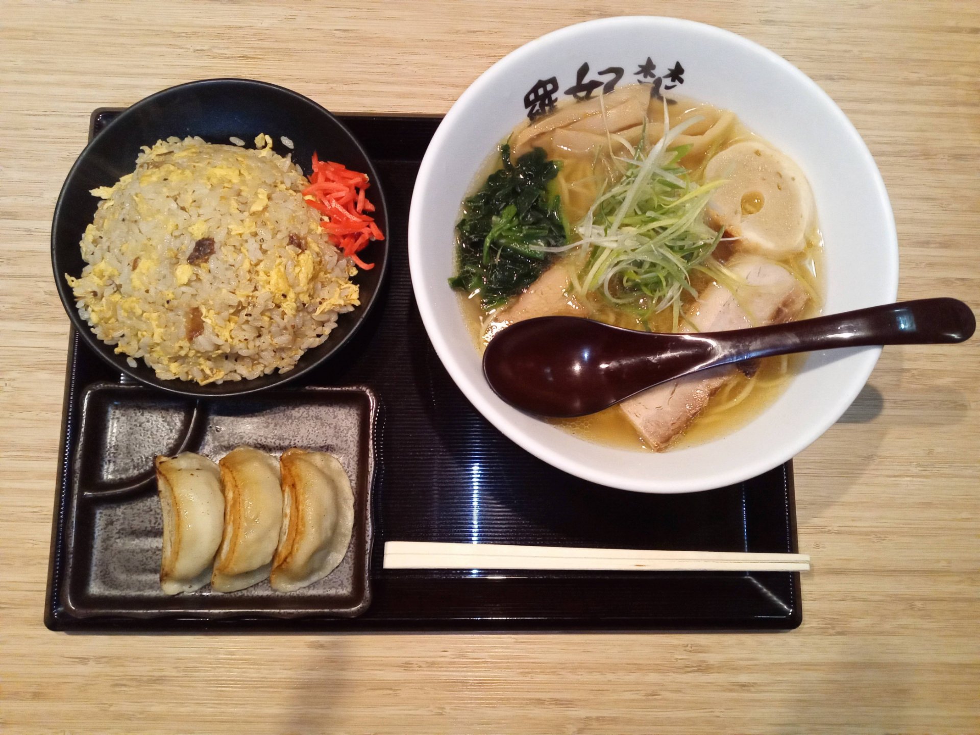 羅妃焚の今月のメニューは、「函館塩ラーメン」です。こちらもなかなか美味しかったのでご紹介します。「函館塩ラーメン」は、北海道の四大ラーメンの一つのご当地ラーメンです。あっさり塩味で透明感のある海鮮スープに中細ストレート麺。具材は、ほうれん草、白髪ネギ、麩、メンマ、チャーシューです。チャーハン+ギョーザのセットでお腹いっぱい食べました。